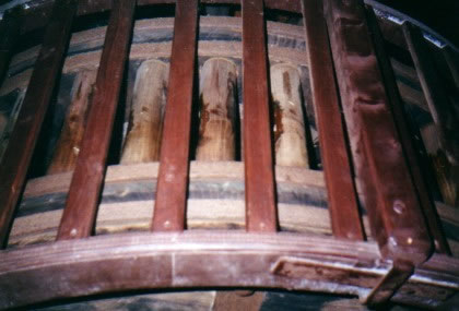 This cage wheel is driven by the windmill. The brown slats are there to keep tourists from sticking their hands in it. Notice the wear on the rounded pins.
