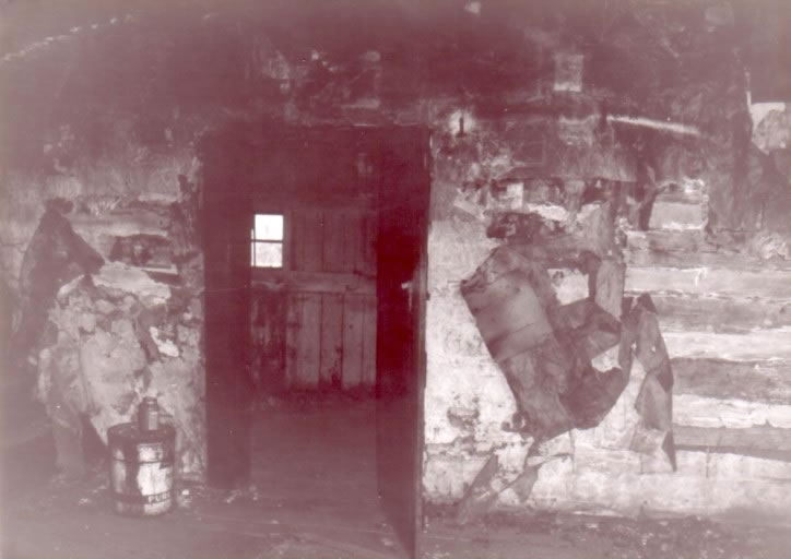 from inside the cabin looking toward what would have been a door going
