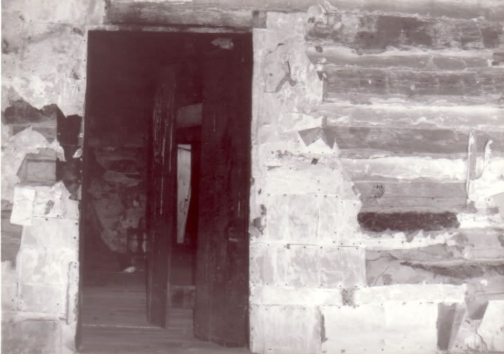 Looking into the cabin toward a wood wall. In the very backof this image there was a staircase that wound around and up to the right to the attic area. It looked as if this was used as a sleeping area at times.