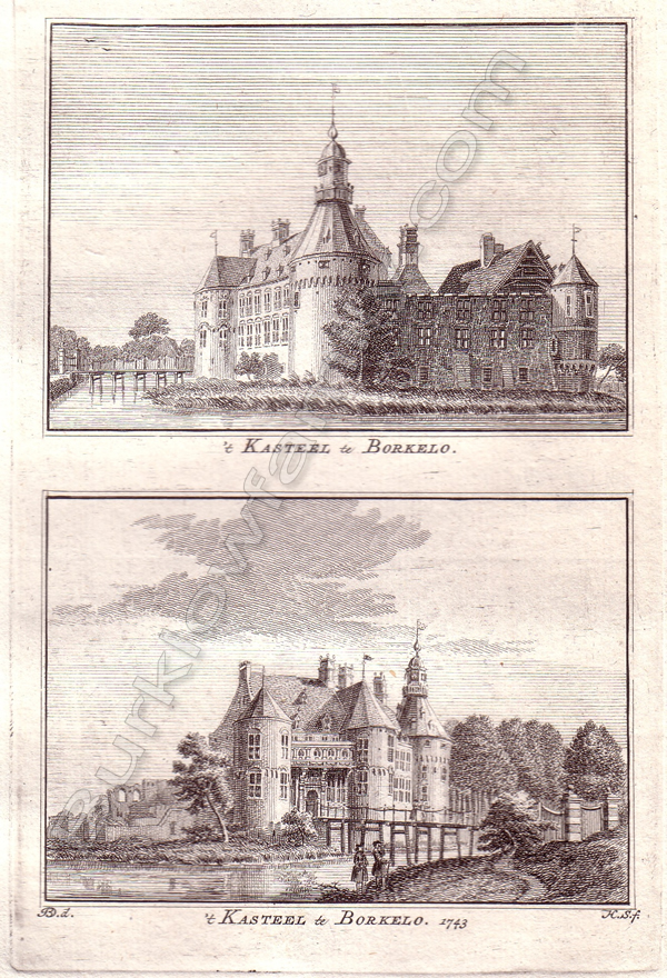't Kasteel te Borkelo - 1743 This original old antique print / plate / view originates from a Dutch book of town and city views called: 'Het verheerlykt Nederland of Kabinet van hedendaagsche gezigten', Amsterdam, 1746 edition. The exact dates the plates were engraved vary. Artists and Engravers: Hendrik Spilman (Dutch 1721-1784): Engraver and designer of mostly town and city views. Isaac Tirion (1705-1769) was a successful dutch publisher in Amsterdam who produced extensive volumes of Dutch town plans as well as a number of atlases with maps usually based on those of G. Delisle. His most well known atlas is 'Nieuwe en beknopte hand-atlas.' Borculo began as a settlement near where, at the time, the Berkel joined a smaller stream called the Grolse Slinge.[1] In the 12th century a castle called the Hof van Borculo was built. A defensive wall surrounding the village was constructed in 1348. The village received city rights in 1375. The city wall is demolished, but parts of the defensive moat which was also used as a trading route over the Berkel to the city's along the Berkel (such as Zutphen), can still be found in Borculo.